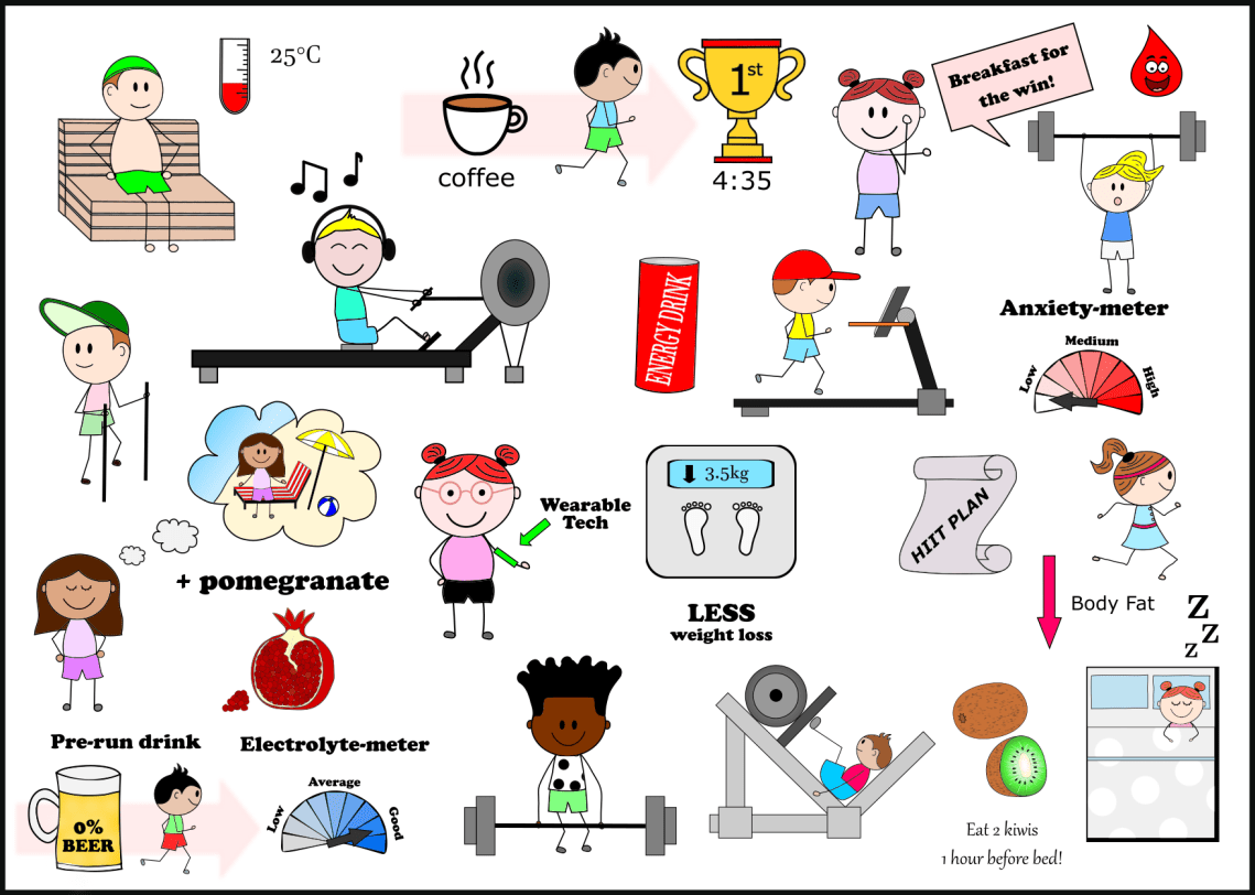 Drink coffee before running. Listen to fast-paced music during exercise. Drink beetroot juice. Take ketone supplements. Listen to your favourite music during warm up. Avoid sauna use the day before. Train your breathing muscles. Avoid blood donation 2 weeks before competitions. Take pomegranate extract. Use poles for hill walking. Buy the Nike Vaporfly. Train with an altitude mask. Eat breakfast. Maintain electrolytes with non-alcoholic beer. Drink energy drinks.